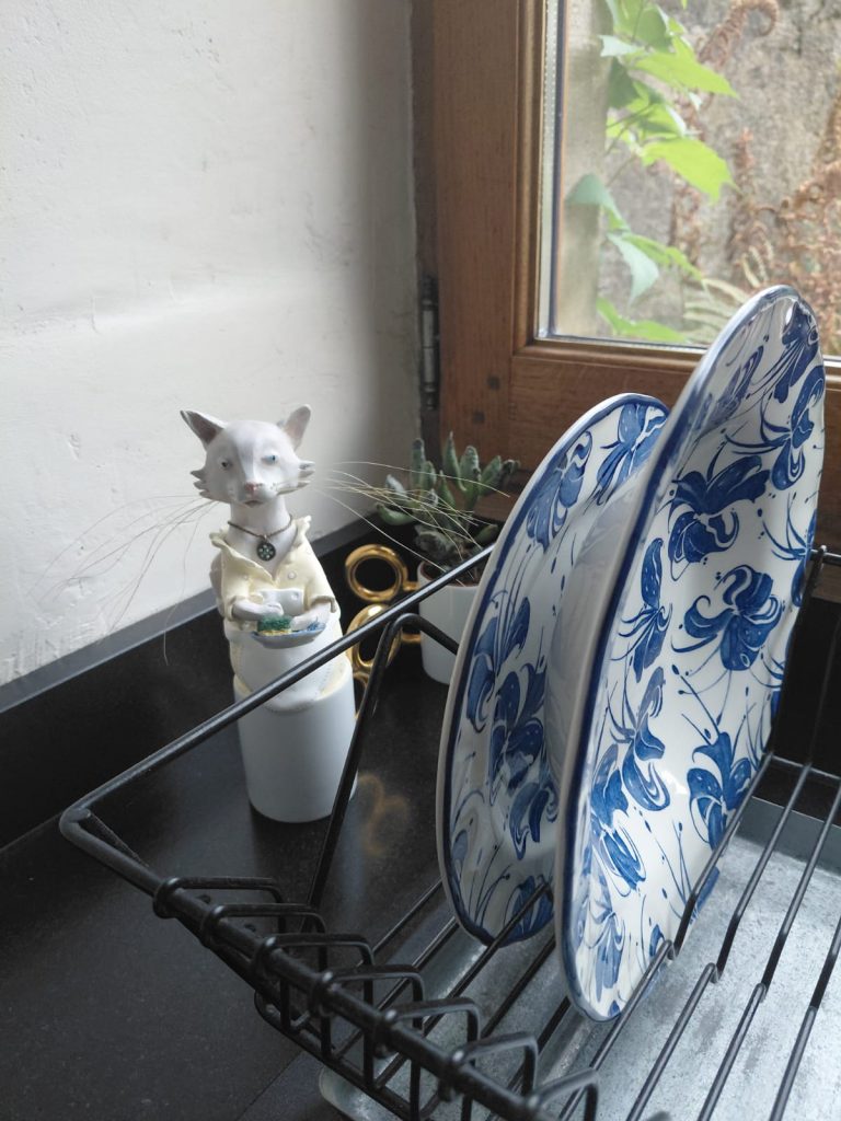Dominique m’a d’ailleurs également envoyée une photographie d’une de ses assiettes bleues qu’elle souhaitait retrouver comme un clin d’oeil dans la composition.