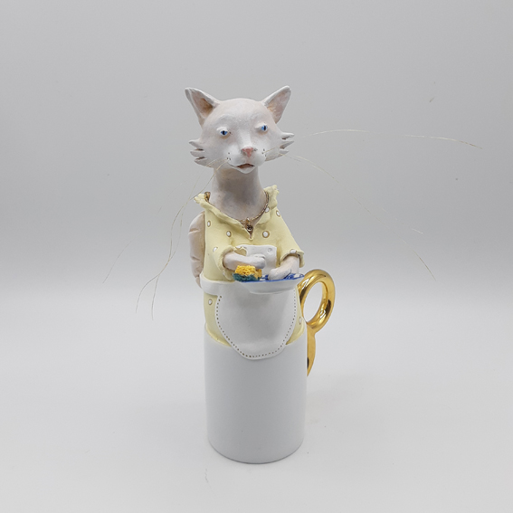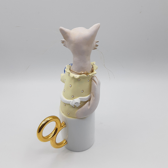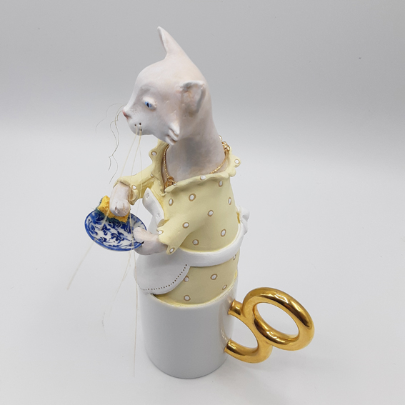Dominique est un jour entrée à l’atelier avec cette petite tasse à café blanche à hanse dorée, me demandant si je pouvais y installer une petite chatte délicate. Cette tasse était sortie de son service, légèrement fissurée donc difficilement utilisable quotidiennement à la maison mais encore tout à fait en état pour y créer un volume à ma façon.