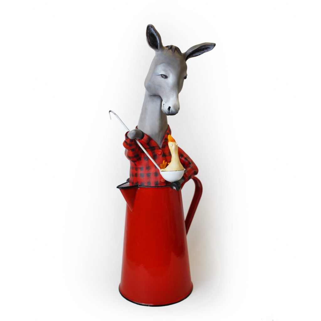 volumes en pâte à bois peints à la main, dans une bouilloire émaillée et un petit bol en céramique