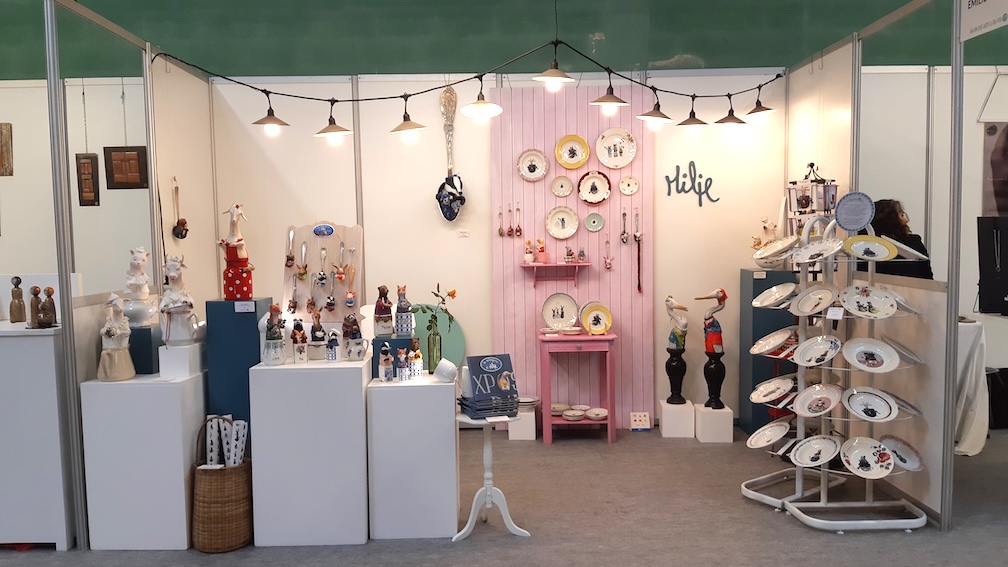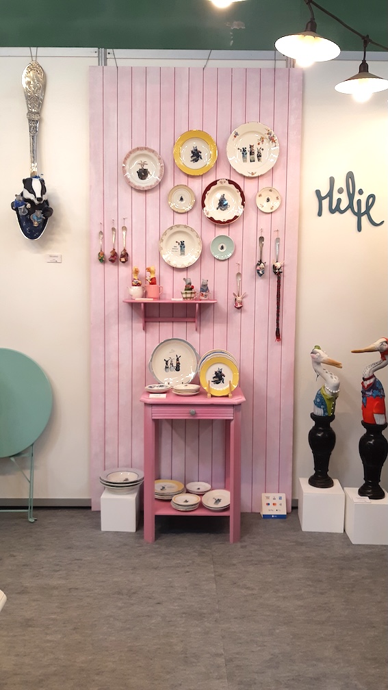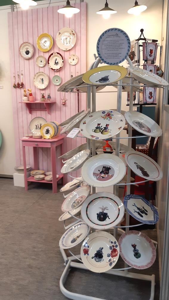 J’ai choisi de donner la part belle à ma série d’assiettes encore jamais exposées au salon, pour l’occasion j’ai sorti non pas un mais deux présentoirs. Et j’ai réalisé une paroi rose pour suspendre les plus belles et donner du peps à mon stand 58 !