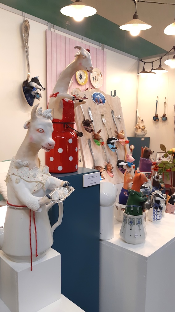 Les toutes dernières sculptures étaient également du voyage. En effet, j’ai exposé trois grandes pièces de la série récente des Meringues, mais aussi la Crémière (la chèvre sur le pot au lait émaillé rouge à pois blancs), une dizaine de nouveaux Épiciers créés spécialement en septembre-octobre ainsi qu’une nouvelle série de cuillères. Au fond, on peut voir quelques sculptures plus anciennes telles les Hérones ou La fonte des glaçons, sans oublier la grande blairelle. Il y avait du monde !