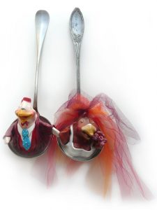 pièces uniques et originales – à suspendre – créations 2009Poussinette, poulet, poulette et poule(pâte à bois dans cuillère à dessert, à glace ou à soupe – de 15 à 21 cm de hauteur)