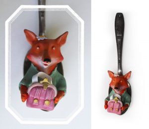 Ils sont à l’affiche de l’exposition en cours au restaurant le KIWI, au Mas d’Azil en Ariège. Ils font partie de la série très louche dernièrement créée. Le corbeau et le renard forment un beau duo. Pique-nique entre amis modelage en pâte à bois dans une cuillère de service et une louchette -…