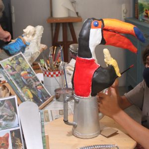Cela fait déjà une semaine que le stage s’est terminé, un autre est prévu pour dans 10 jours… Trois personnes participaient, deux adultes et un enfant. Chacun est arrivé avec une idée assez précise de ce qu’il souhaitait créer : un toucan dans une vieille cafetière pour Ravi, un chat musicien dans une cuillère…